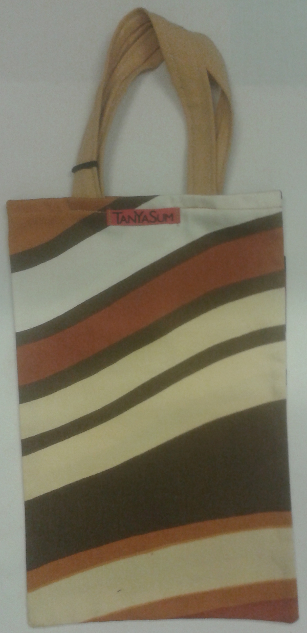 Suorakulmion muotoinen ruskearaidallinen kangaskassi. Mitat K30 L19, hihna n.29cm.