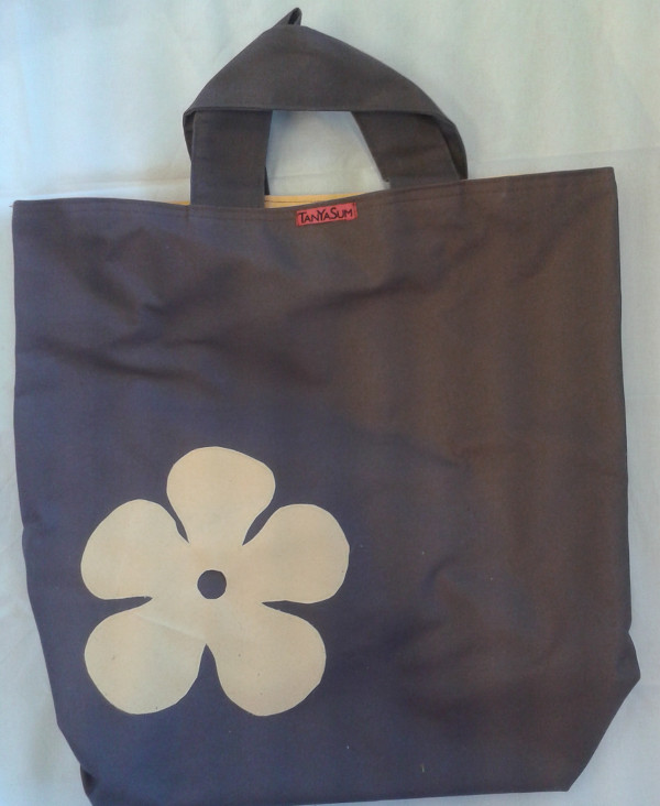 Ruskea laukku rullaverhokankaasta keltaisella kukalla. Mitat: L46, K46, hihna n.35cm.