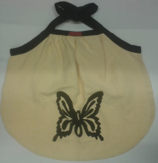 Vaaleankeltainen, pussimainen kangaskassi, jossa perhonen-painokuva. Mitat: K44, L51, hihna n.54cm.